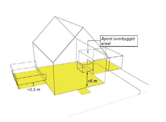 Ikke arealer under f.eks. balkong som ligger mer enn 5 meter over terrenget.
